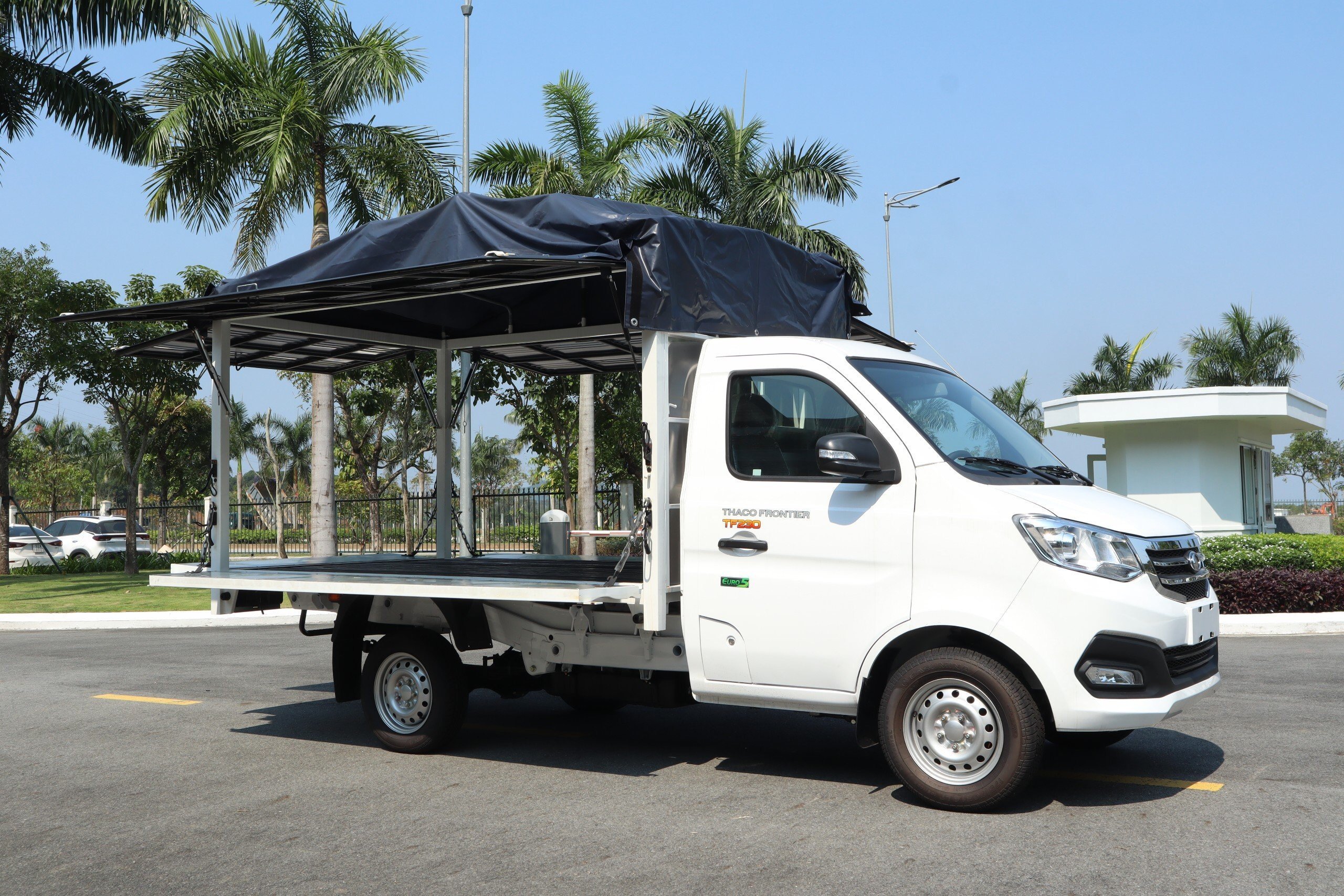 - Khung vỹ trên bửng mở lật lên 85 độ (có ty hơi trợ lực) để làm mái che, thuận tiện bán hàng.